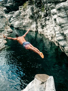 Discover the cliff diving at Ponte Brolla, safely under the expert guidance of Diego Schütz. An unforgettable adventure that will challenge the heights in the cool crystal-clear waters.