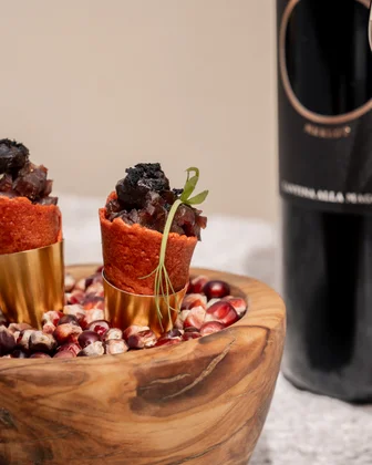 - Ascona Riserva, Merlot Ticino DOC Riserva, accompagné d'un cornetto à la tomate farci d'entrecôte d'agneau mariné, de tomates séchées au soleil et d'olives