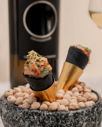 - Ricordi Orange Wine, Bianco IGT della Svizzera Italiana, accompagné d'un cornetto au sésame farci de truite saumonée suisse et de yuzu