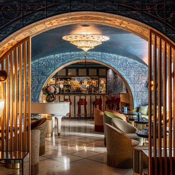 Il Bar Bassa Selim, con il suo design raffinato, si distingue per il suo affascinante colore blu intenso. Lasciatevi trasportare nell'atmosfera dell'opera "Il ratto dal serraglio" di Mozart, dalla quale è stata tratta ispirazione.